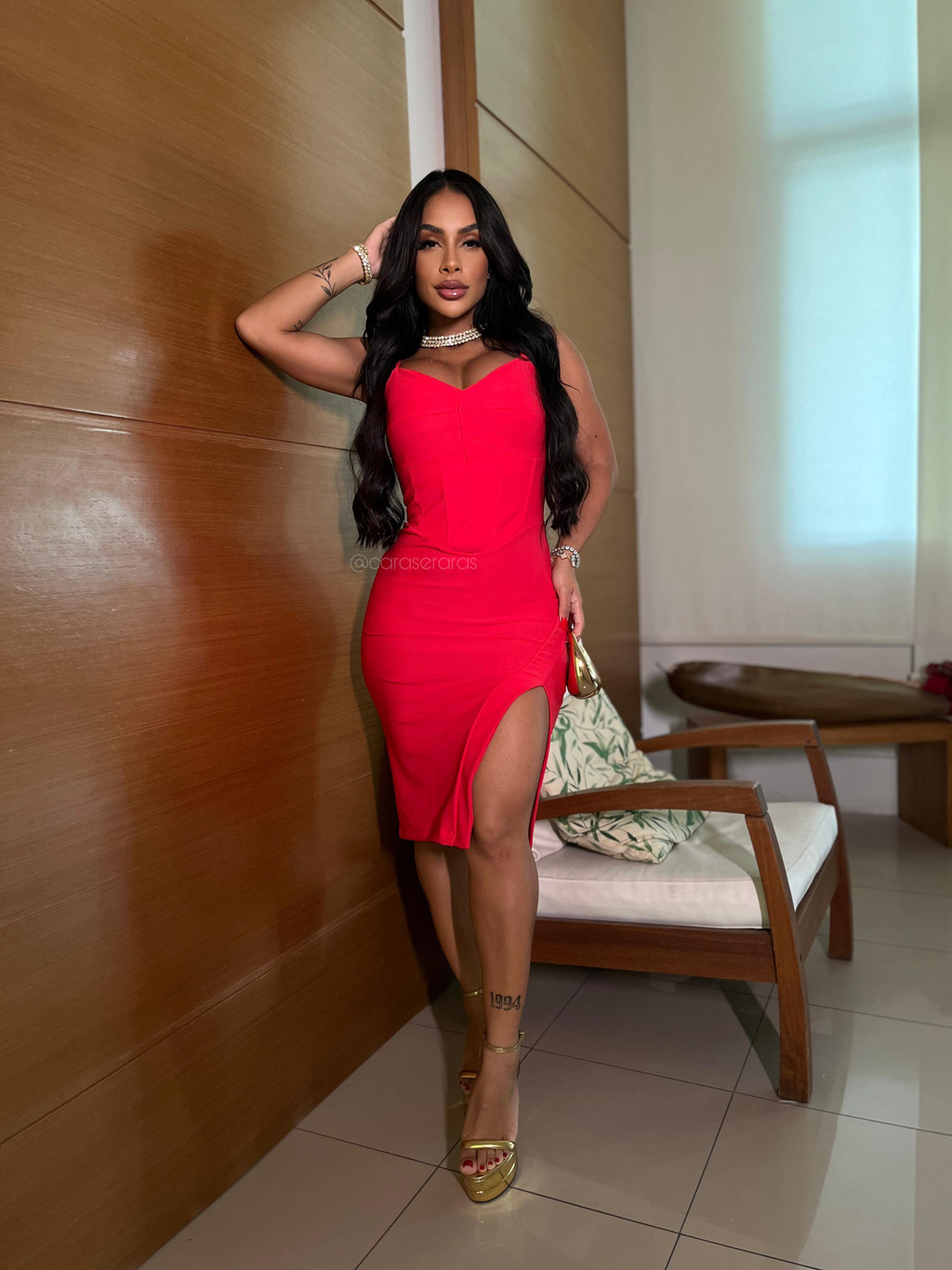 Com bojo e detalhes que remetem a um corset, arruma o busto e valoriza as curvas. Sua generosa fenda frontal proporciona um toque de ousadia, enquanto o comprimento midi o torna elegante e sofisticado.